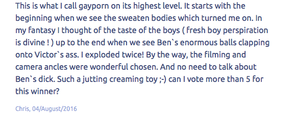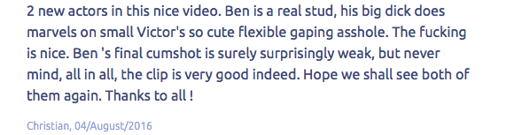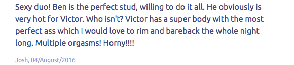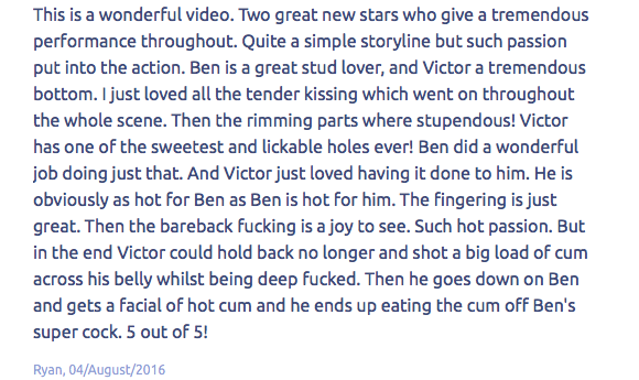 I’m so glad all the fans seem to enjoy seeing Ben in action. He’s not a twink obviously, and sometimes more defined or bigger built guys can get a bit of a hard time from some of the fans. I think he has everything going for him though, he’s handsome and buff, and he has a truly amazing uncut cock too. And as you say, Victor is gorgeous, a bottom any one of us would love to pound all night long until the sun comes up! :)